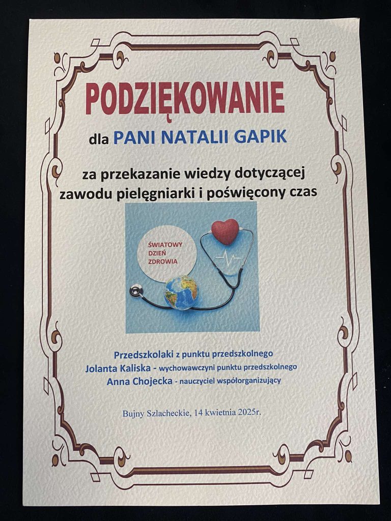 Jest nam niezmiernie miło, że Przedszkolakom z punktu przedszkolnego w Bujnach Szlacheckich spodobała się pogadanka dotycząca zawodu pielęgniarki w wykonaniu naszej pracownicy Natalii Gapik